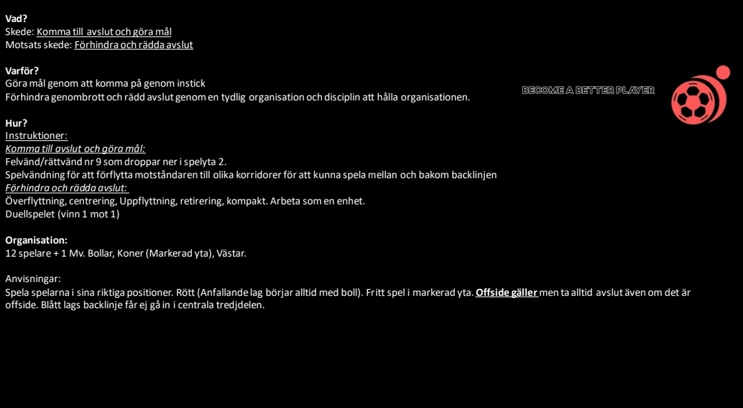 Då är det måndag igen. Vi var matchlediga i helgen så vi har haft två hela dagar med återhämtning. Vilket lovar gott för ett bra tempo på dagens träning. Måndag betyder mycket spel och idag är inget undantag. Vi kommer arbeta med skeden som komma till avslut och göra mål men också arbeta med motsatsförhållandet förhindra och rädda avslut.