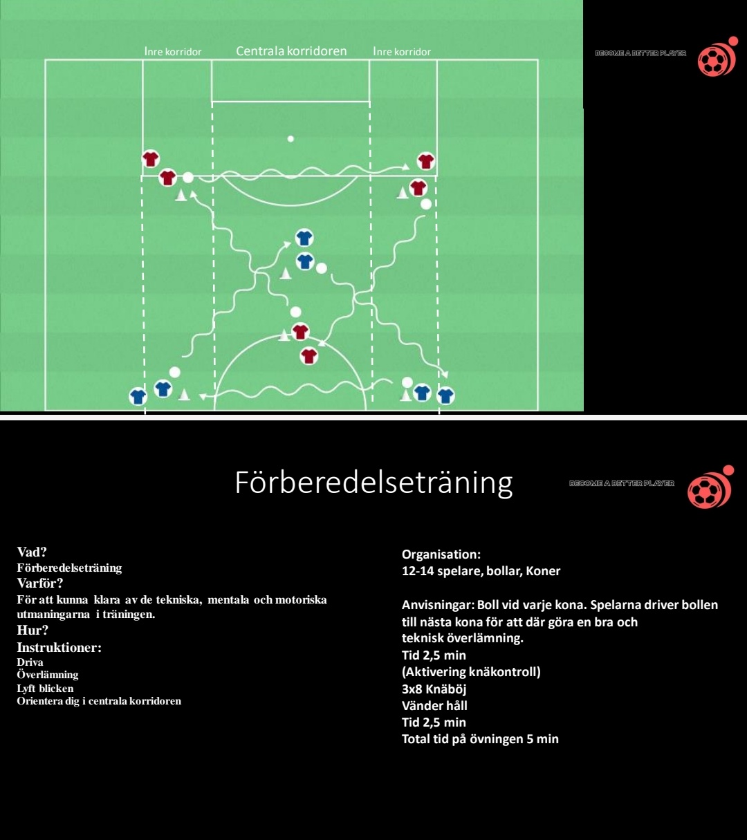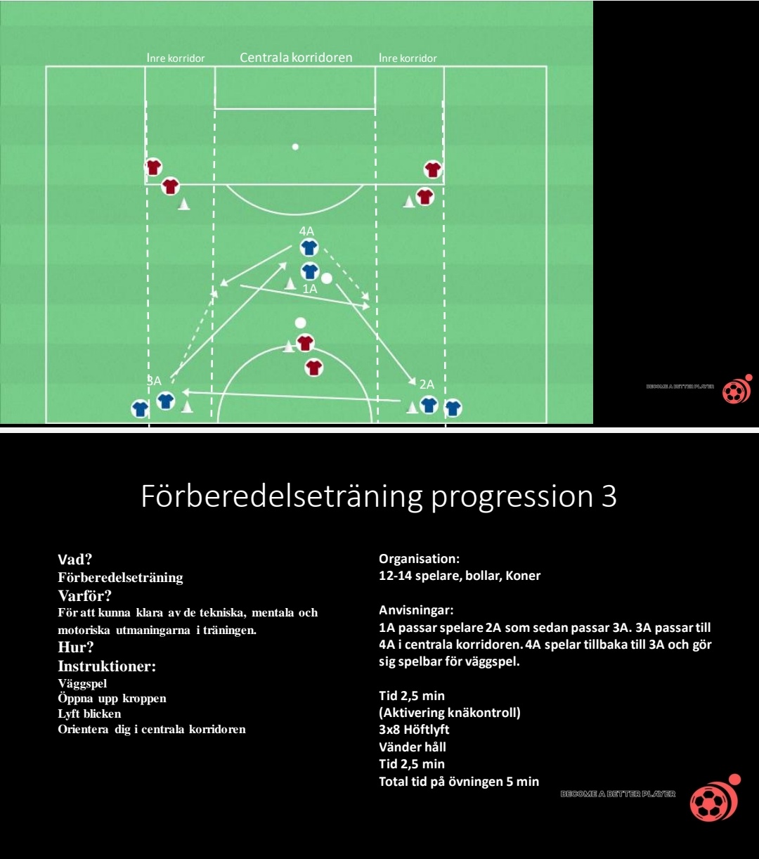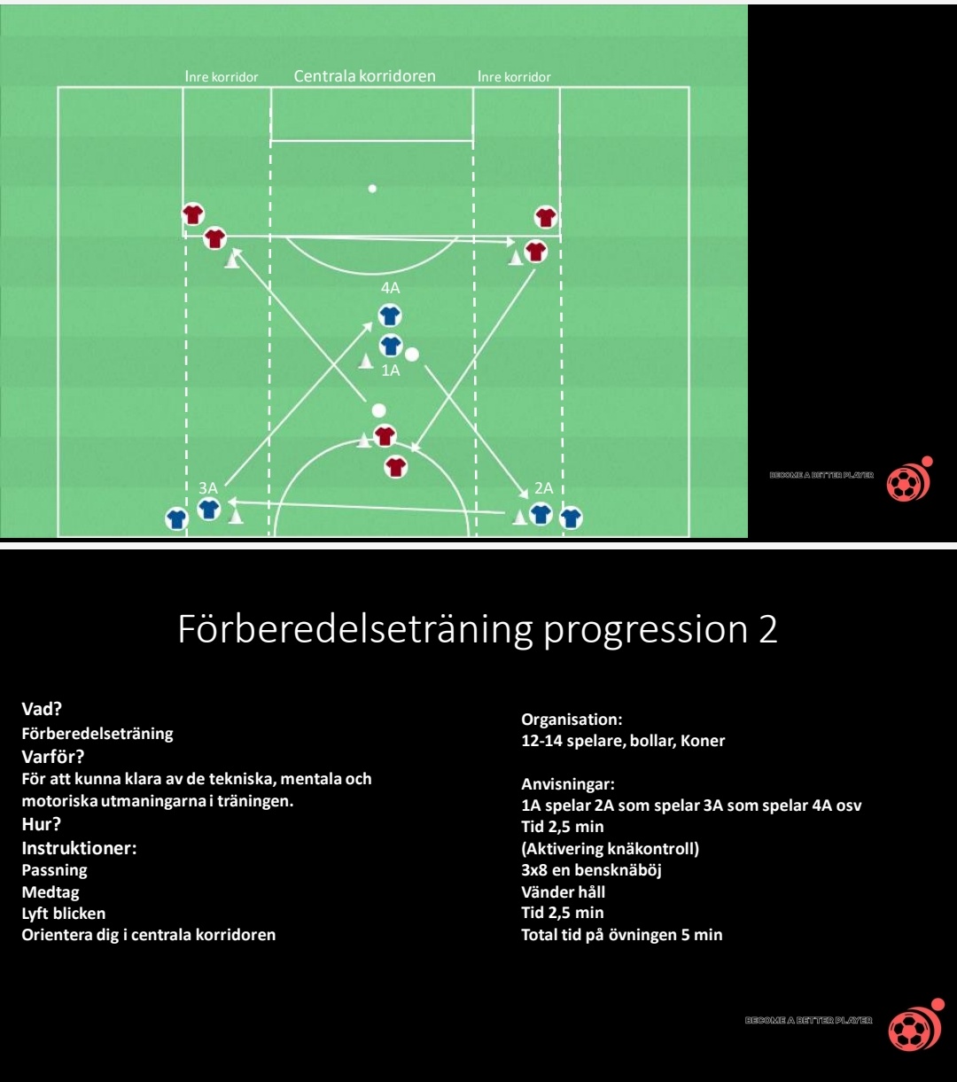 Dagens pass är uppbyggt med färdighetsövning. Syftet med den är att få spelarna bekväma med underlag och boll. Vi stegrar också färdighetsövningen för att utmana spelarna med teknisk svårare aktioner. Vi har också mycket rörelse i centrala korridoren för att tvinga spelarna att orientera sig innan och efter medtag samt passning. Förberedelseövningarna tillsammans med knäkontroll tar ca 20 minuter att genomföra. Viktigt att varje progression så bör aktionerna gå snabbare och snabbare.