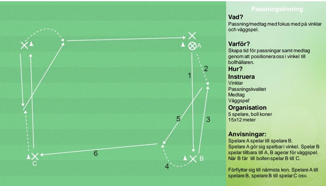 Måndagens pass ligger fokus på FIFA 11+ som förberedandeträning. Sen går vi över på och fokuserar på passningsspel med vinklar och spel på tredjespelare. I spelet stegrar vi från passningar i vinklar och och spel på tredjespelare i spelvändningar för att få en förflyttning på motståndaren. Vi avslutar med större spel där vi applicerar våra principer.